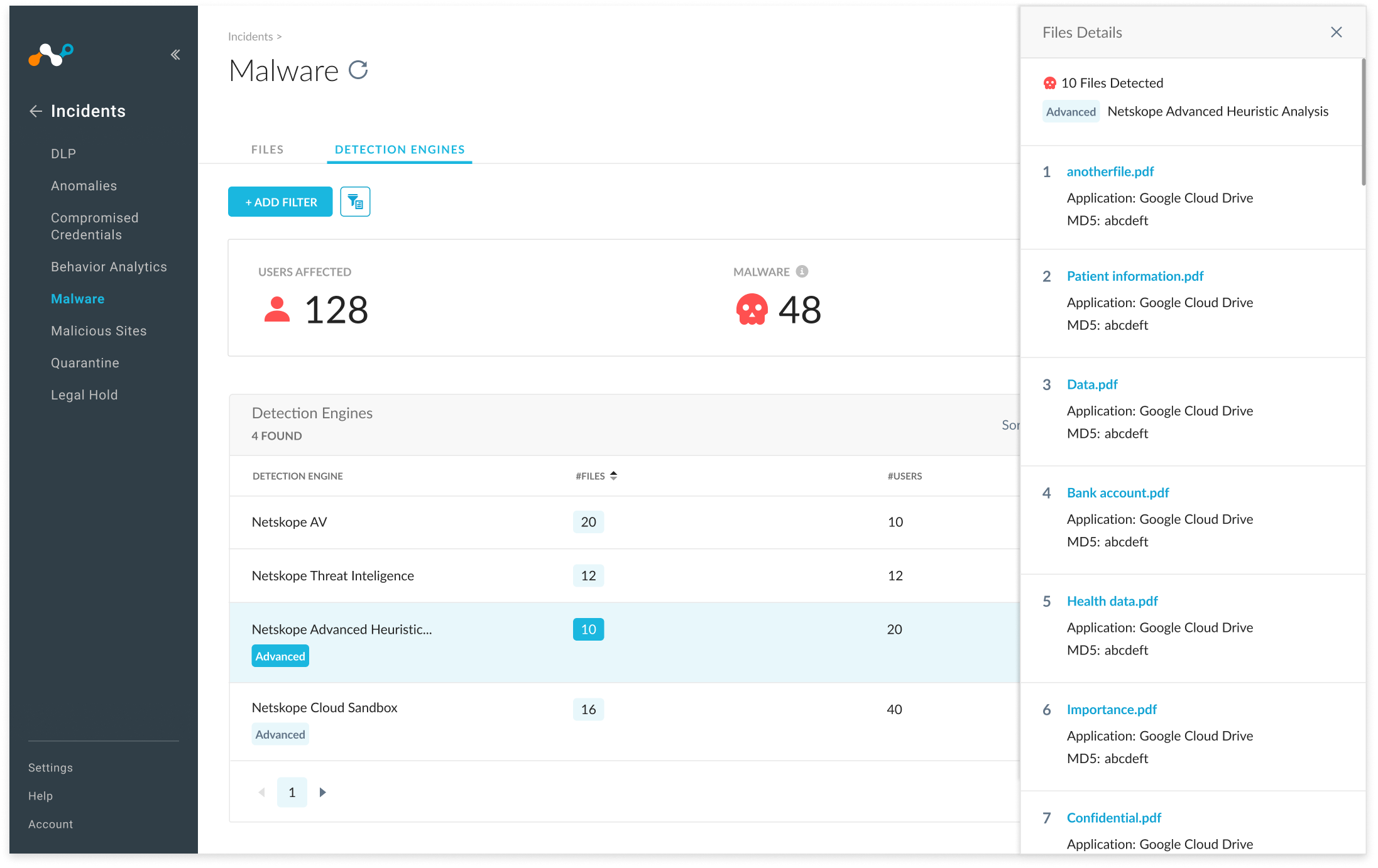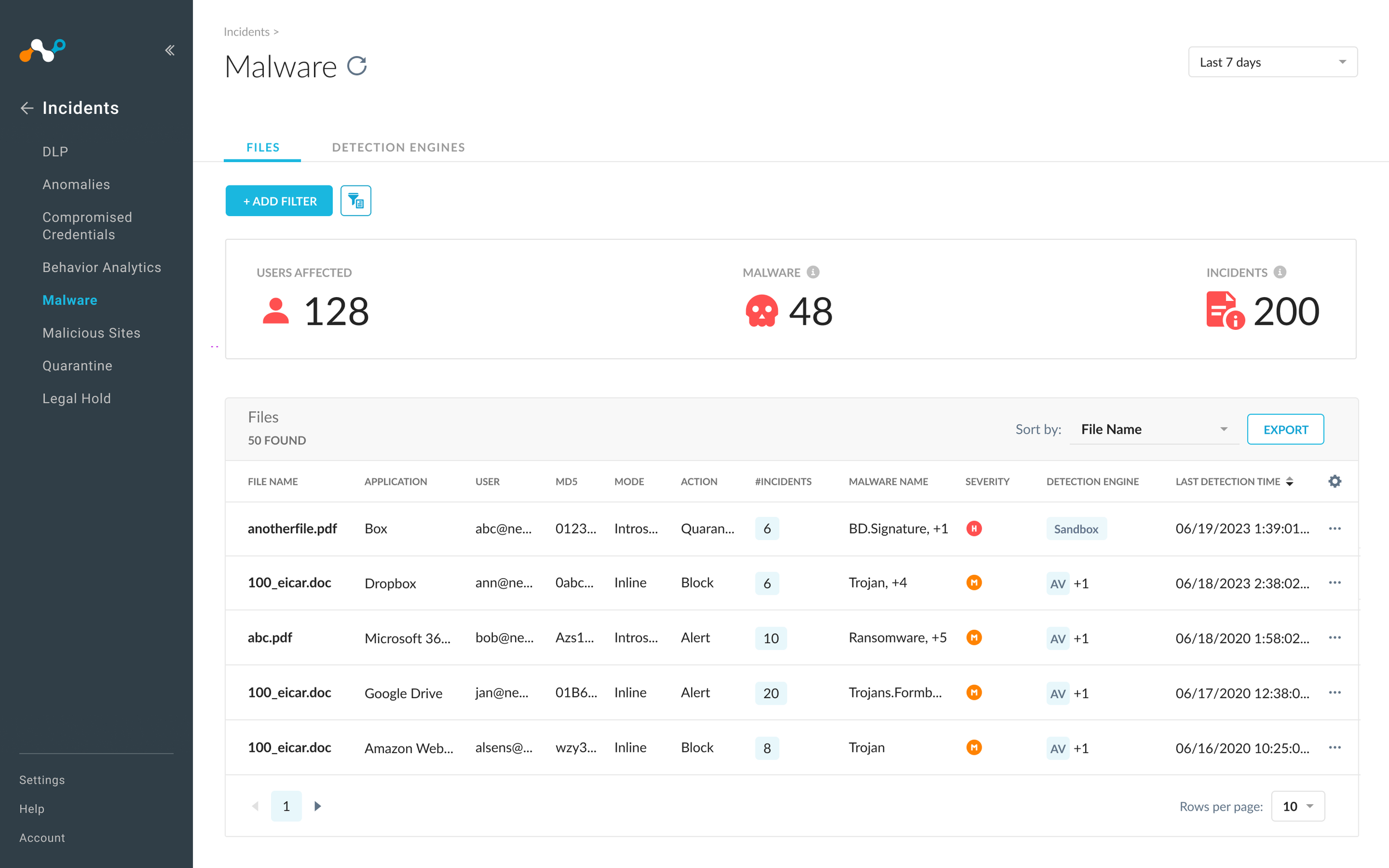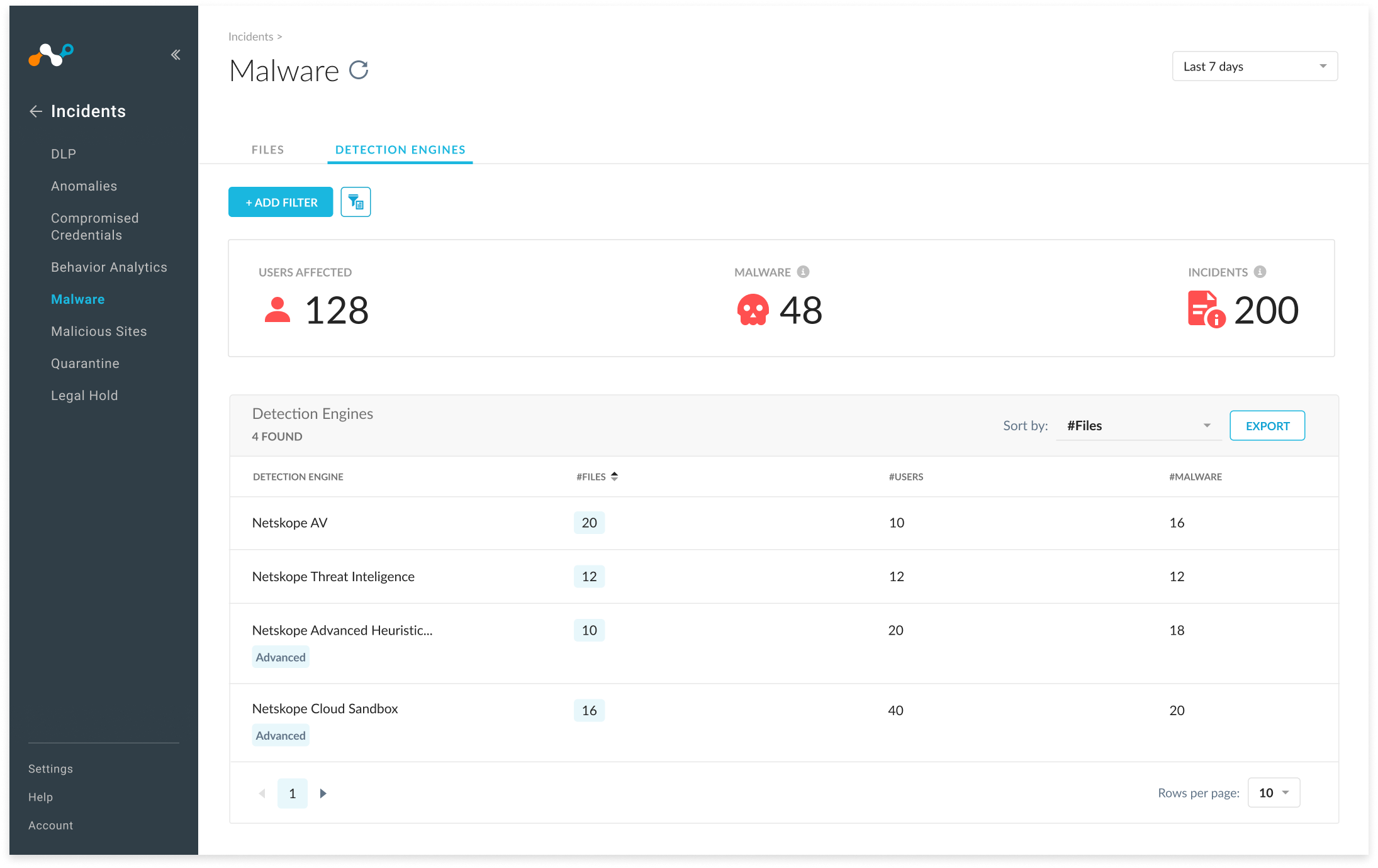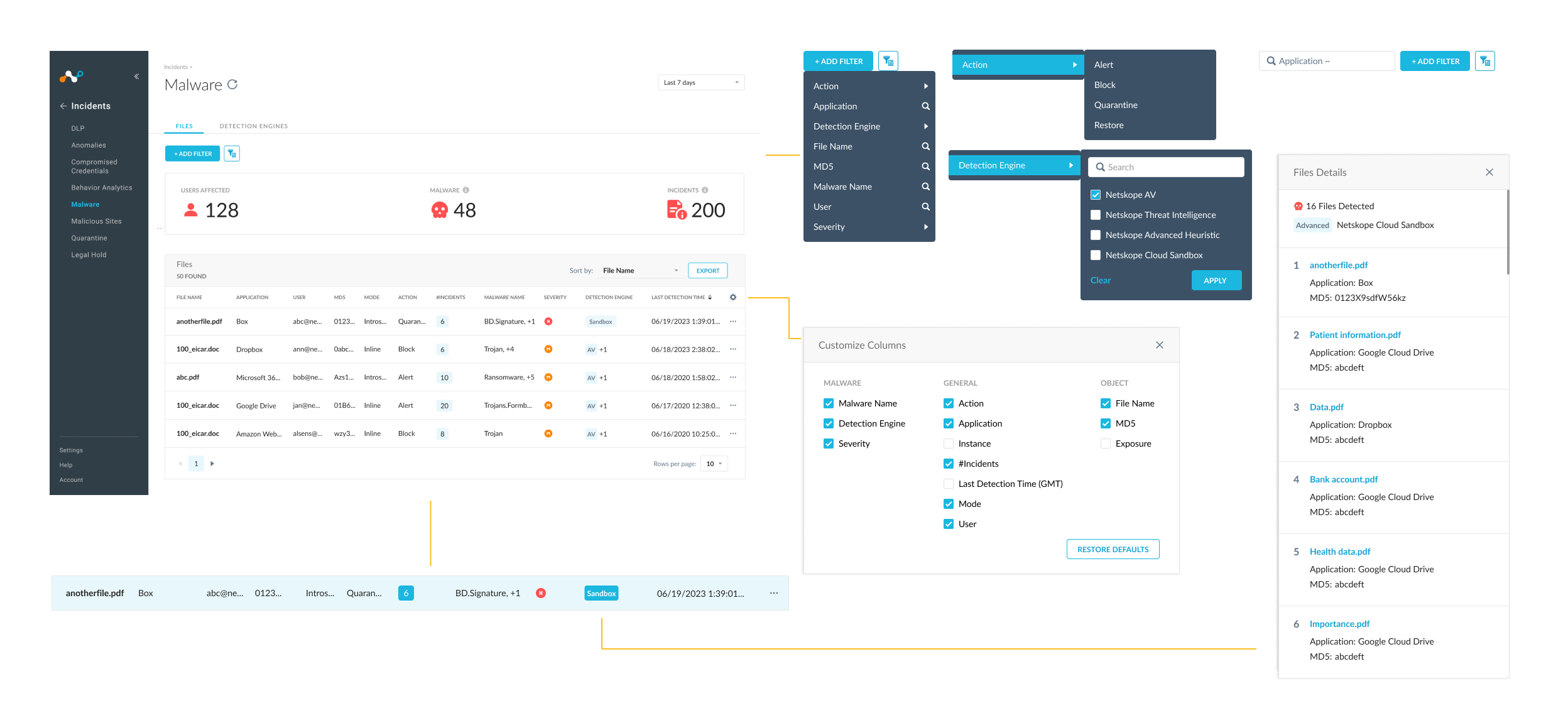 A new experience that adds detection engines and reshuffles the data organization on the incident table, enabling users to prioritize investigations and take effective action on affected files.