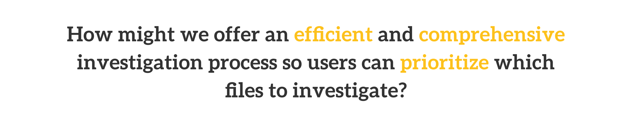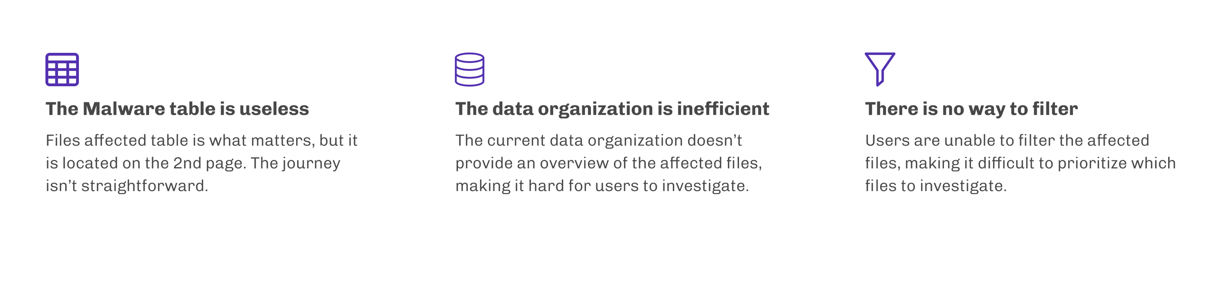 Research revealed that users struggled to prioritize investigations and act on affected files due to missing critical data and poor navigation and data organization in the current design.