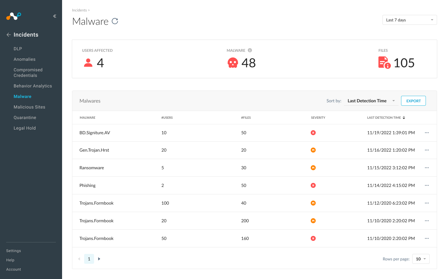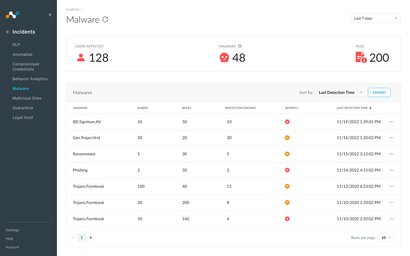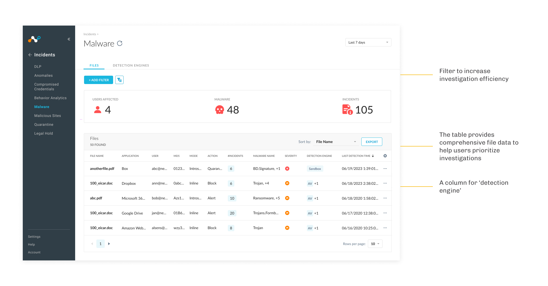 Without detection engines, users can still prioritize investigations by analyzing incident counts, malware severity, users, and applications. However, the current data organization makes this process inefficient.