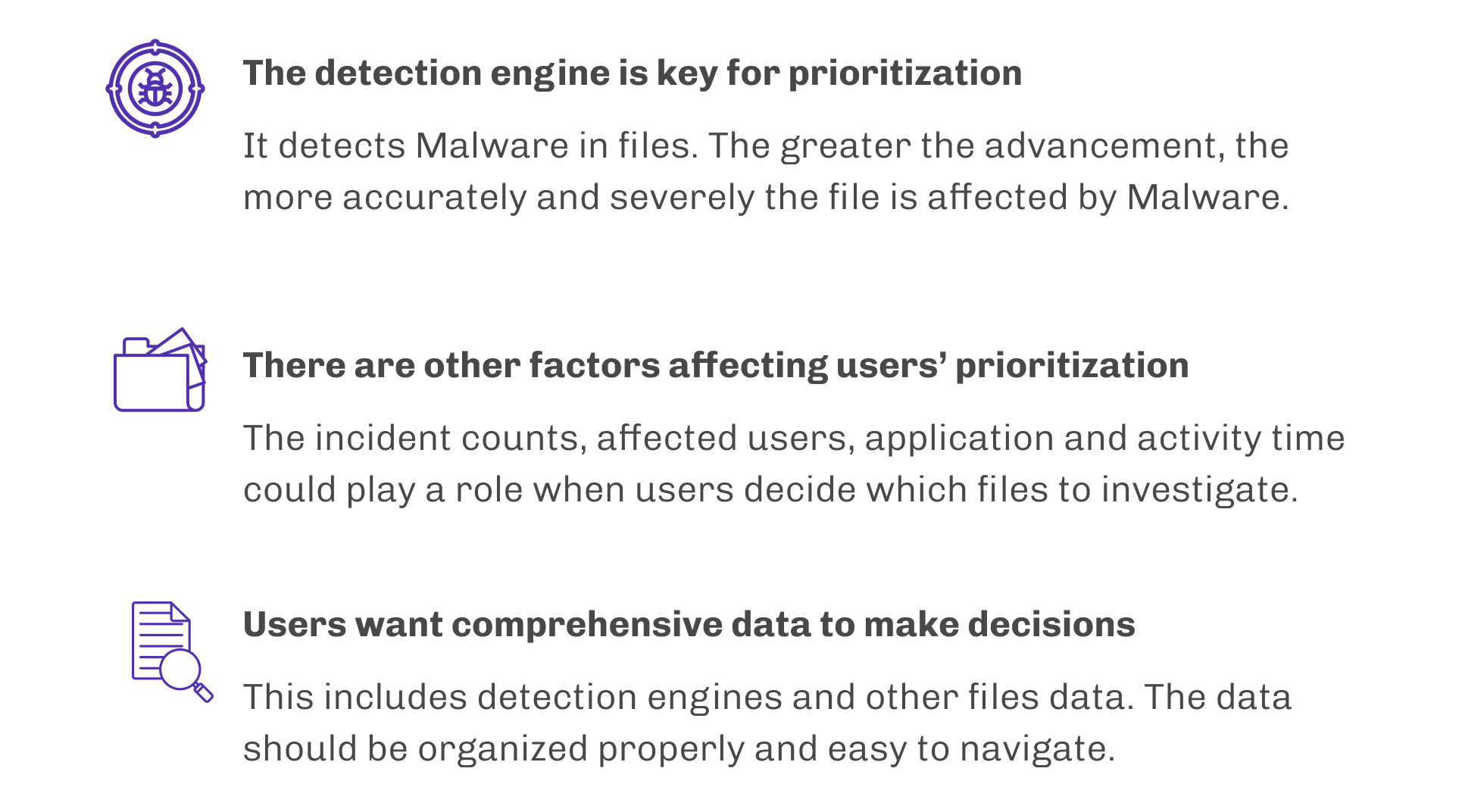 The research reveals that while the detection engine and its accuracy are key for prioritization, there are other factors that influence users' decisions on which files they want to prioritize for investigation.